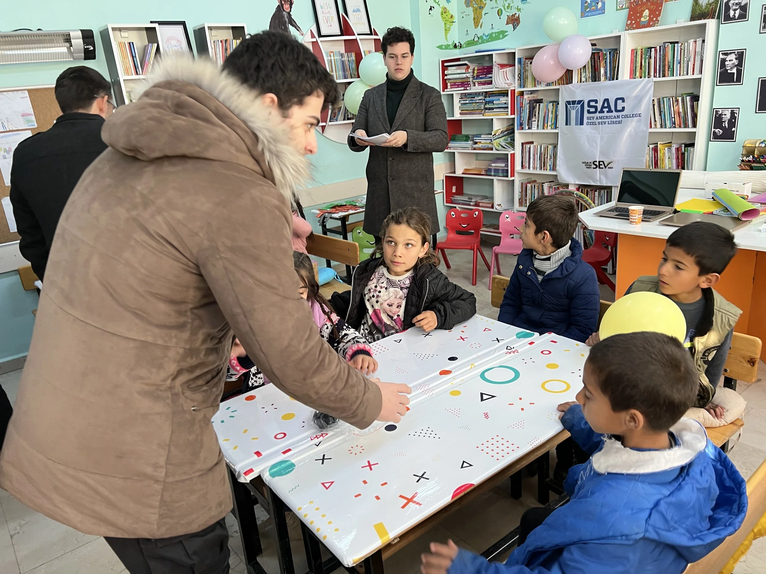 After the opening speech, delivered by the school principal, our SEV American College President, Kuzey Kaya, and Neslihan Aksu, our team posed for photos with the students, while in the background, our volunteers and teachers took additional photos.